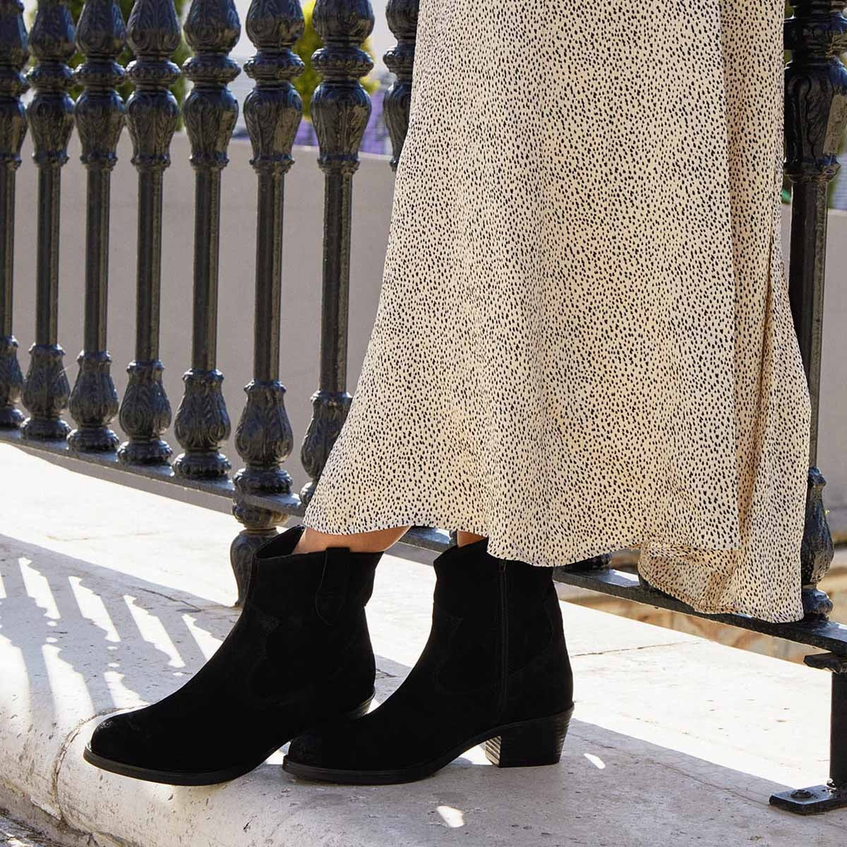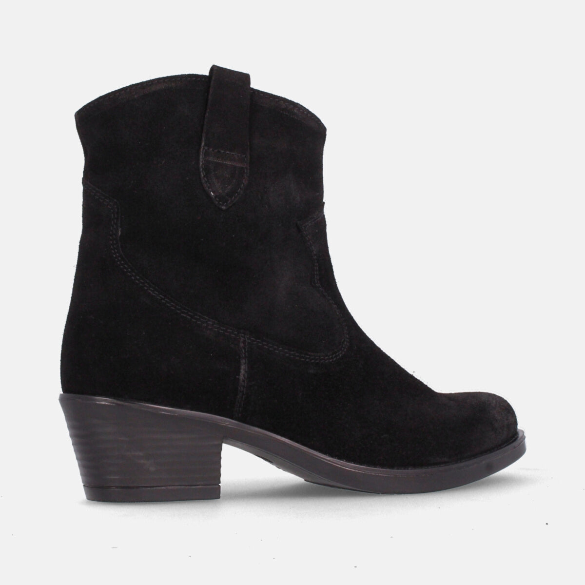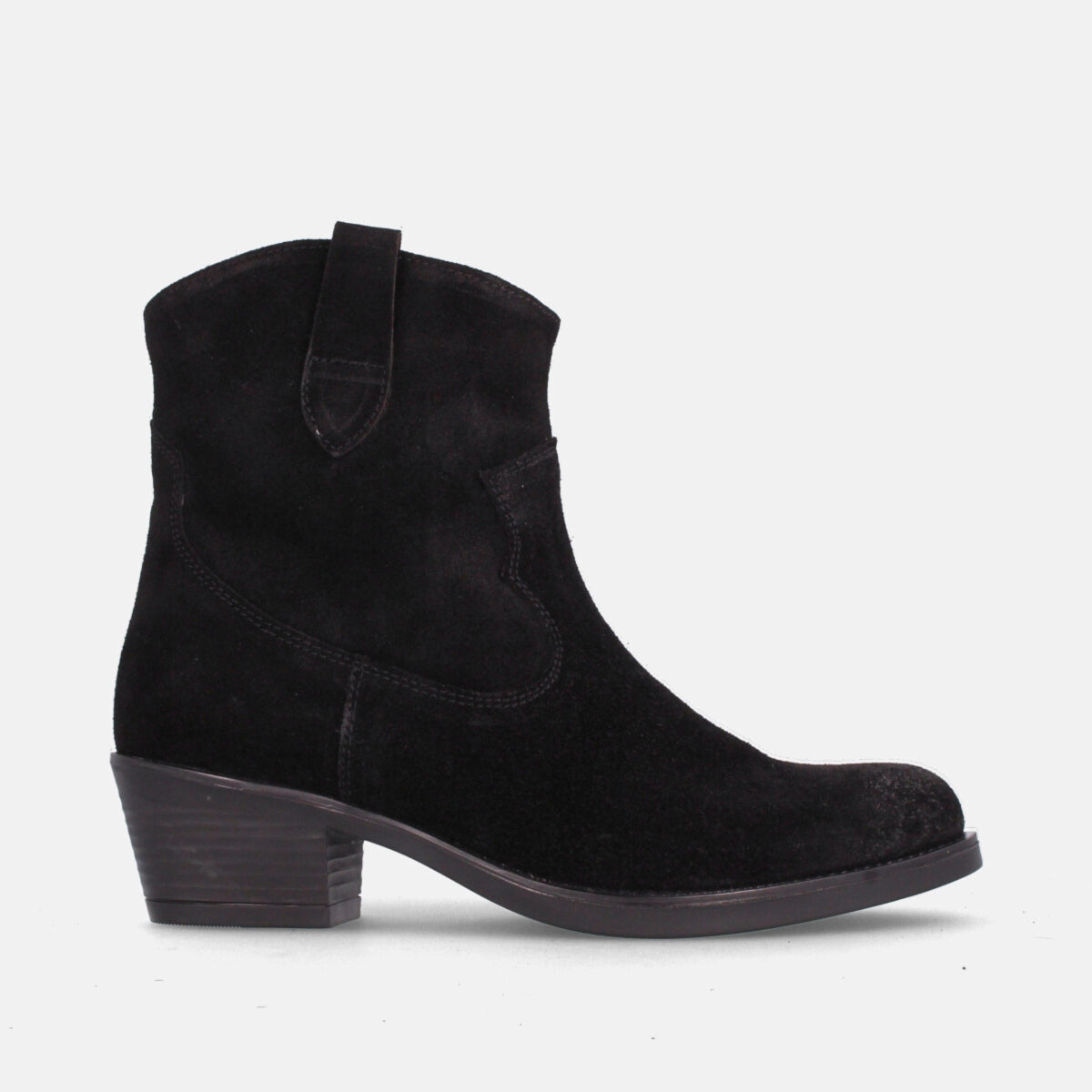 Botín cowboy en color serraje negro para mujer con altura de 4cm de la Colección Otoño/invierno de Marila Shoes. Forro interior en microfibra y planta de piel. ¿Estás preparada para aguantar toda la jornada? con estos botines desde luego que si.