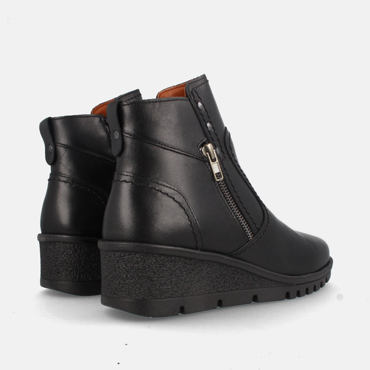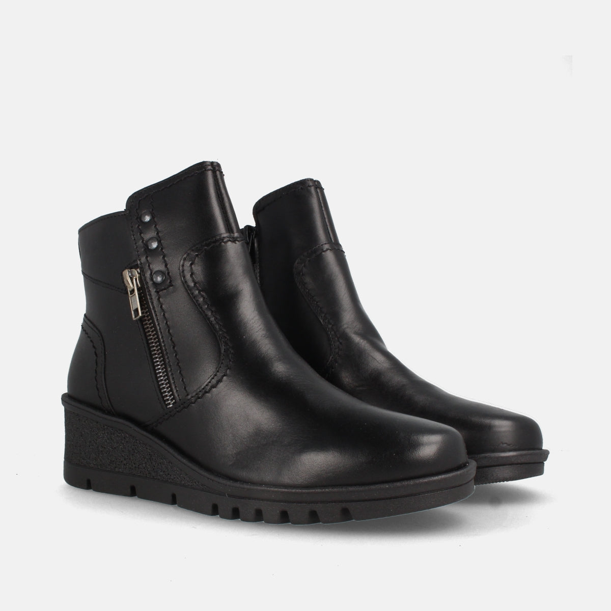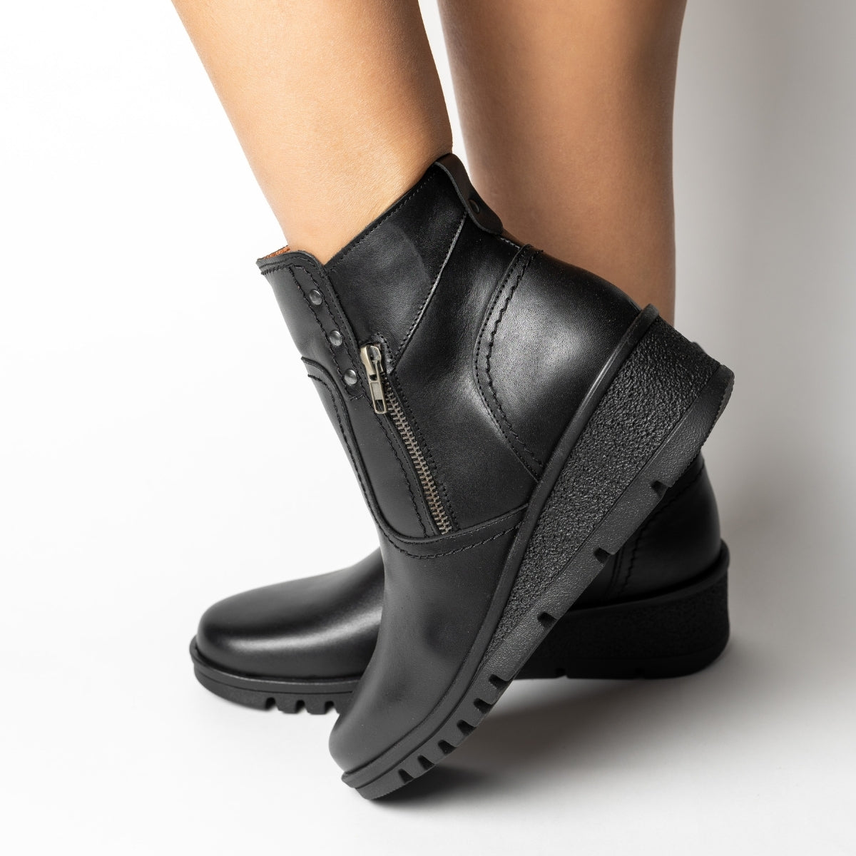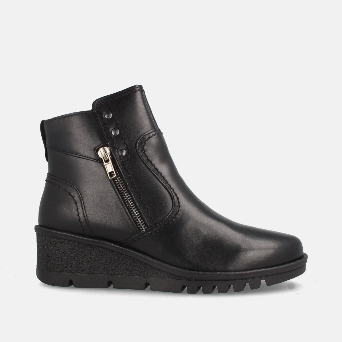 Su cuña media aporta altura sin perder estabilidad, mientras que la suela ligera dentada ofrece seguridad en la pisada. La cremallera lateral permite un calce fácil y rápido, y los detalles de costuras y tachuelas añaden un toque moderno y sofisticado.