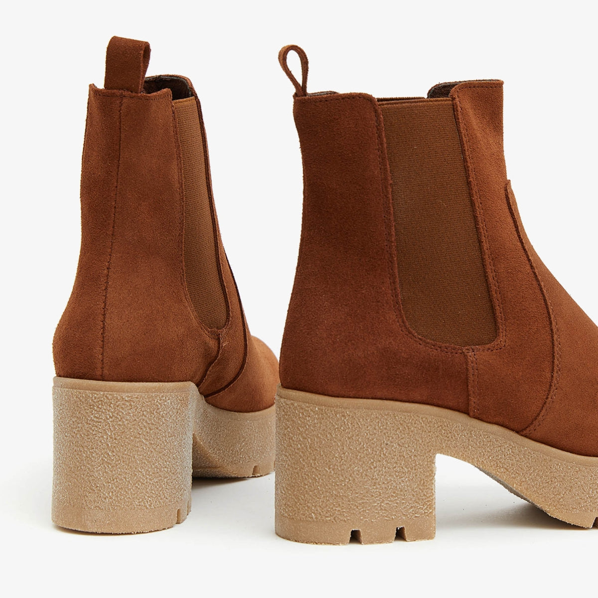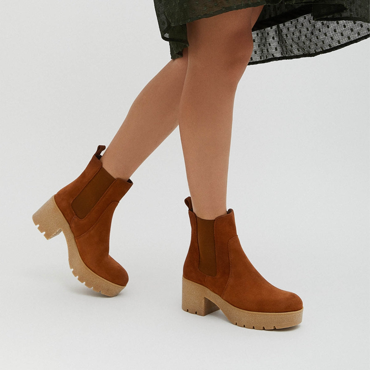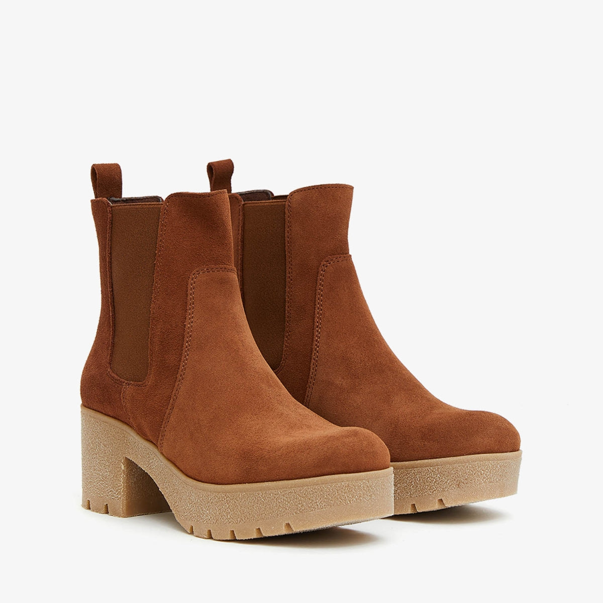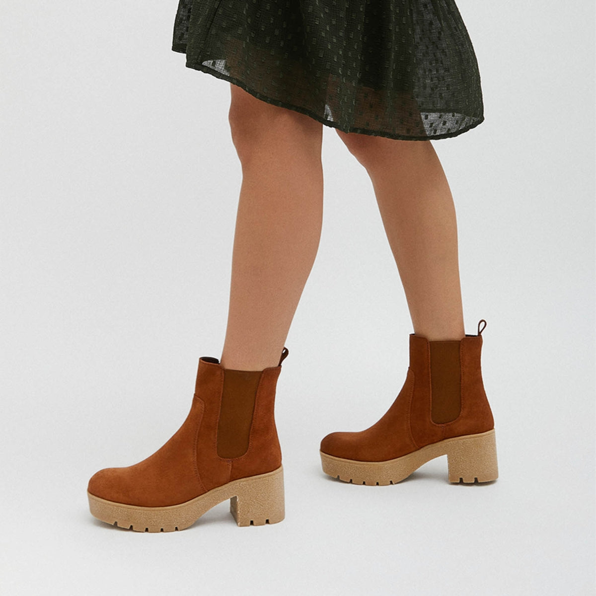 ¡Marca tendencia con nuestro modelo FOREST! Este botín para mujer elaborado en piel serraje color cuero ha venido para conquistar vuestros corazones. Es muy fácil de calzar gracias a sus dos elásticos laterales. El piso es de TR crepé color beig y tiene una altura de 6,5cm y de 3,5cm en su parte delantera. Plantilla de piel con acolchado de 2mm.