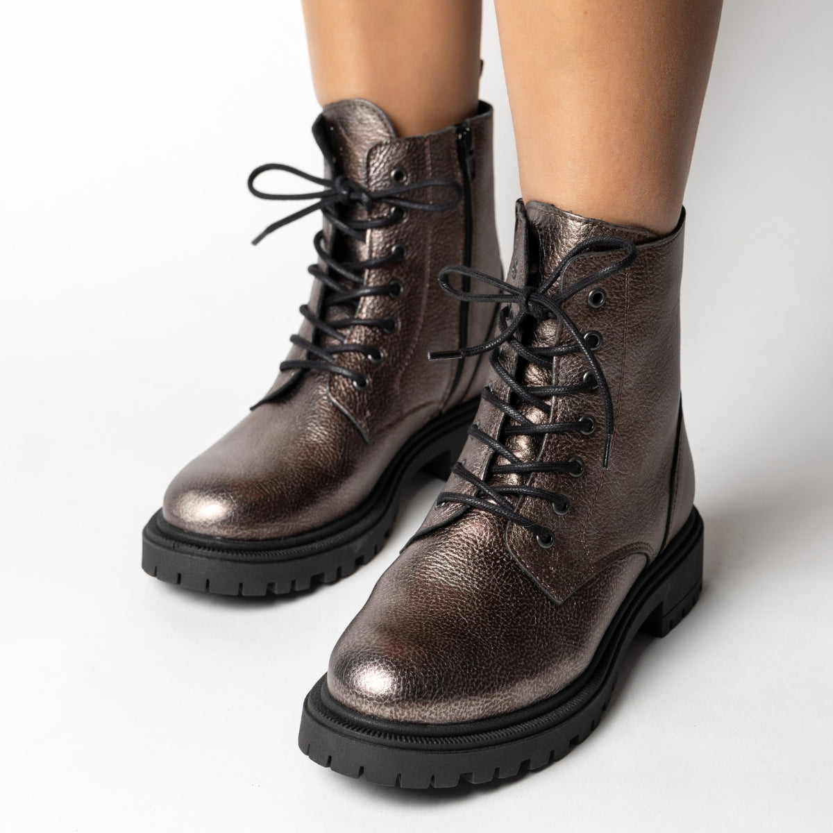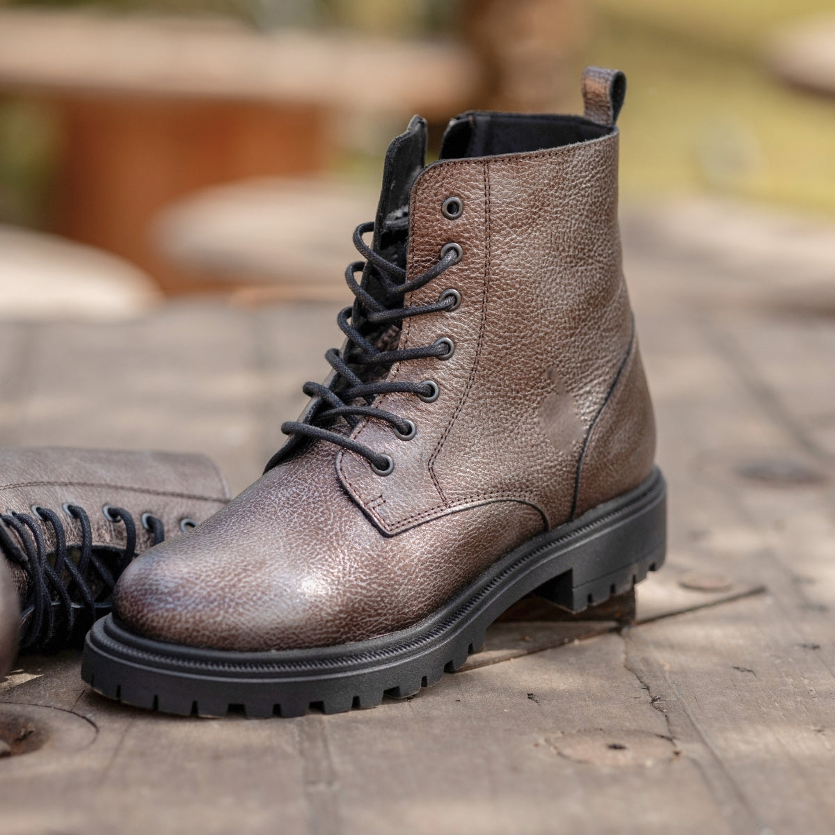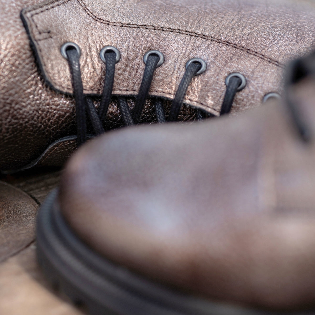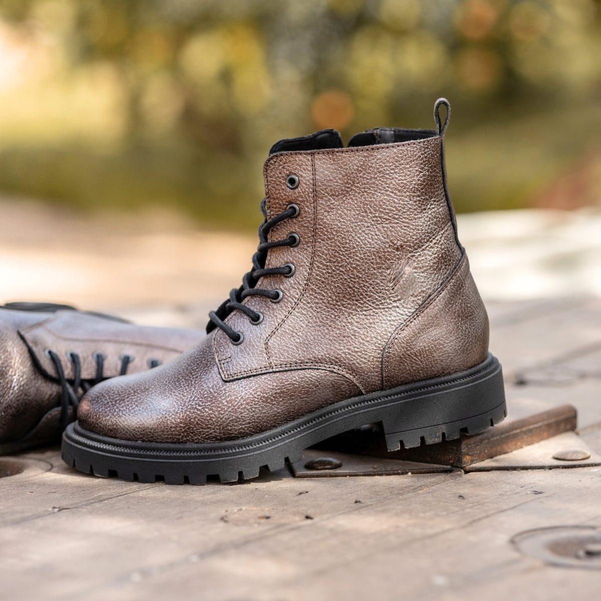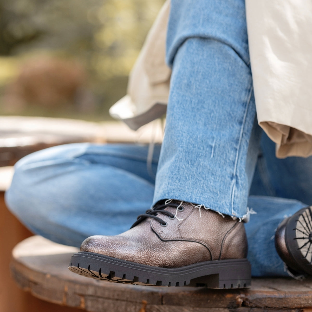 El modelo Hita de Marila Shoes es un botín de inspiración militar que combina fuerza, carácter y comodidad en un diseño urbano muy actual. Fabricada artesanalmente en España con piel natural de acabado metalizado goran cromo, aporta un toque atrevido y moderno a cualquier look.