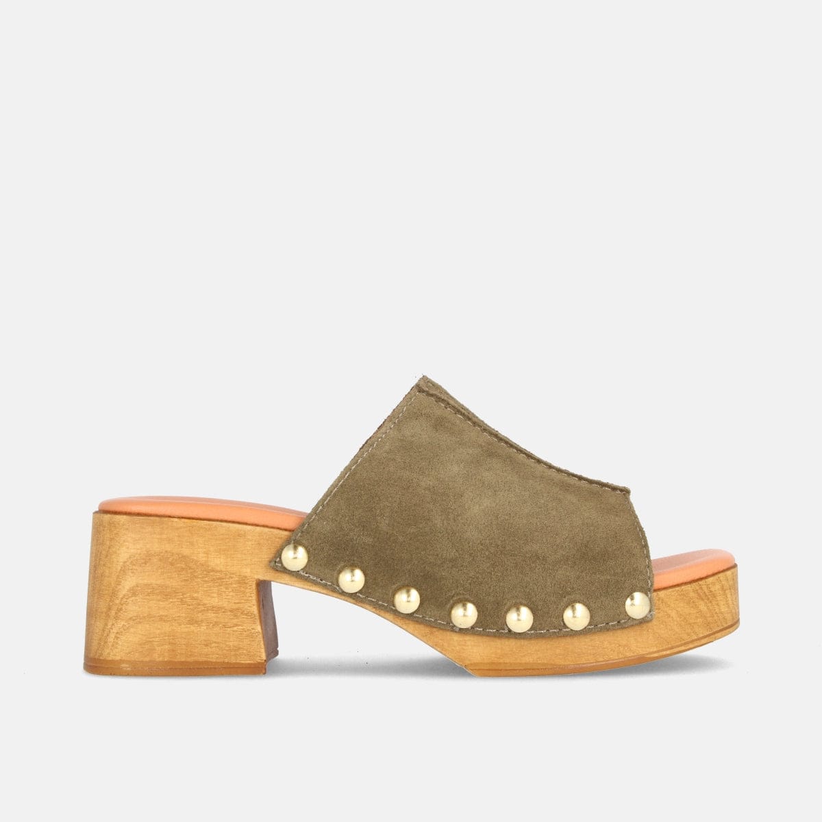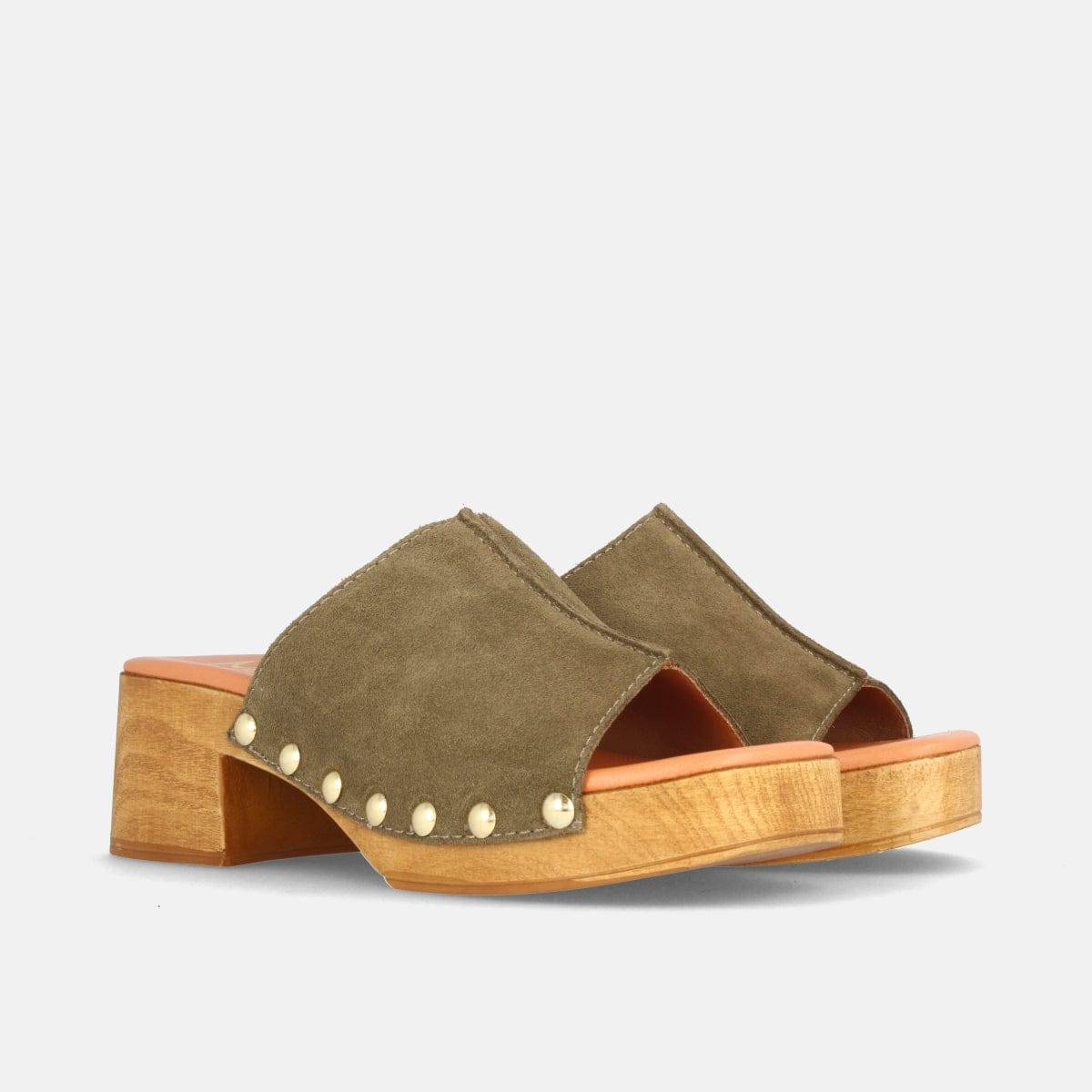 Elegantes y sofisticados zuecos para mujer con cuña media elaborados en serraje color militar.