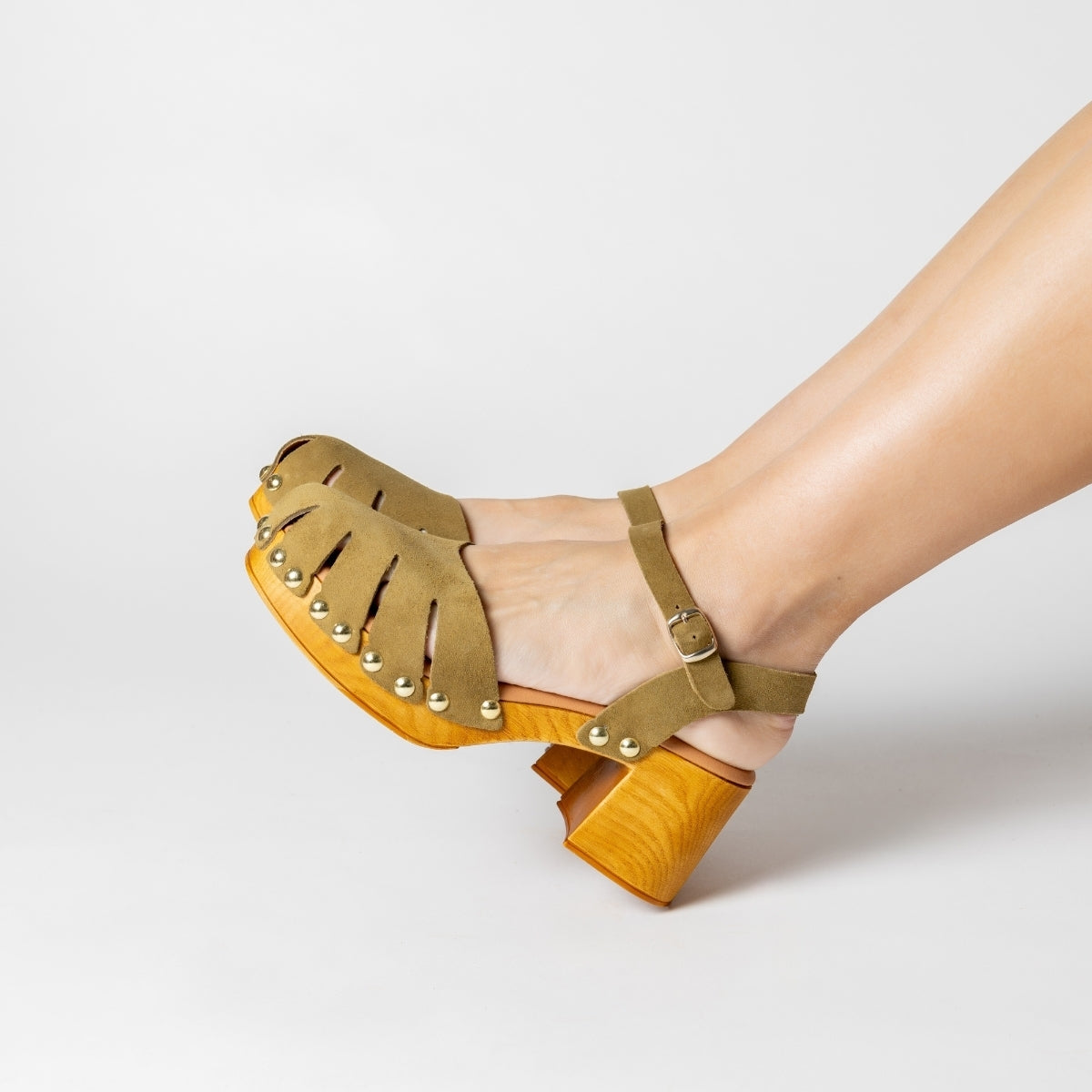 Su estructura es en forma de cangrejera en serraje color militar. La piel va clavada al piso con tachas doradas a ambos lados del empeine. Talón al descubierto. Su cierre es mediante una hebilla dorada regulable. La plantilla es de piel con un acolchado de 5mm. El tacón tiene una altura de 8,5cm y una plataforma de 3cm. El piso es de PU en color madera. Calzado muy ligero. Arréglate y ponte mona sin perder de vista la comodidad.