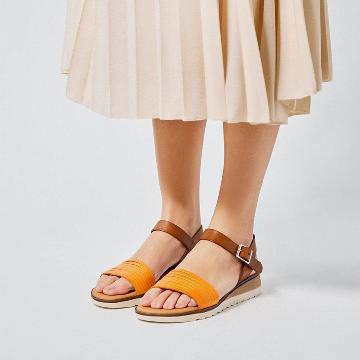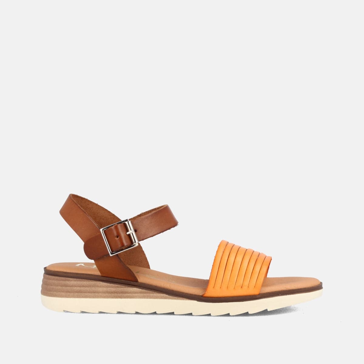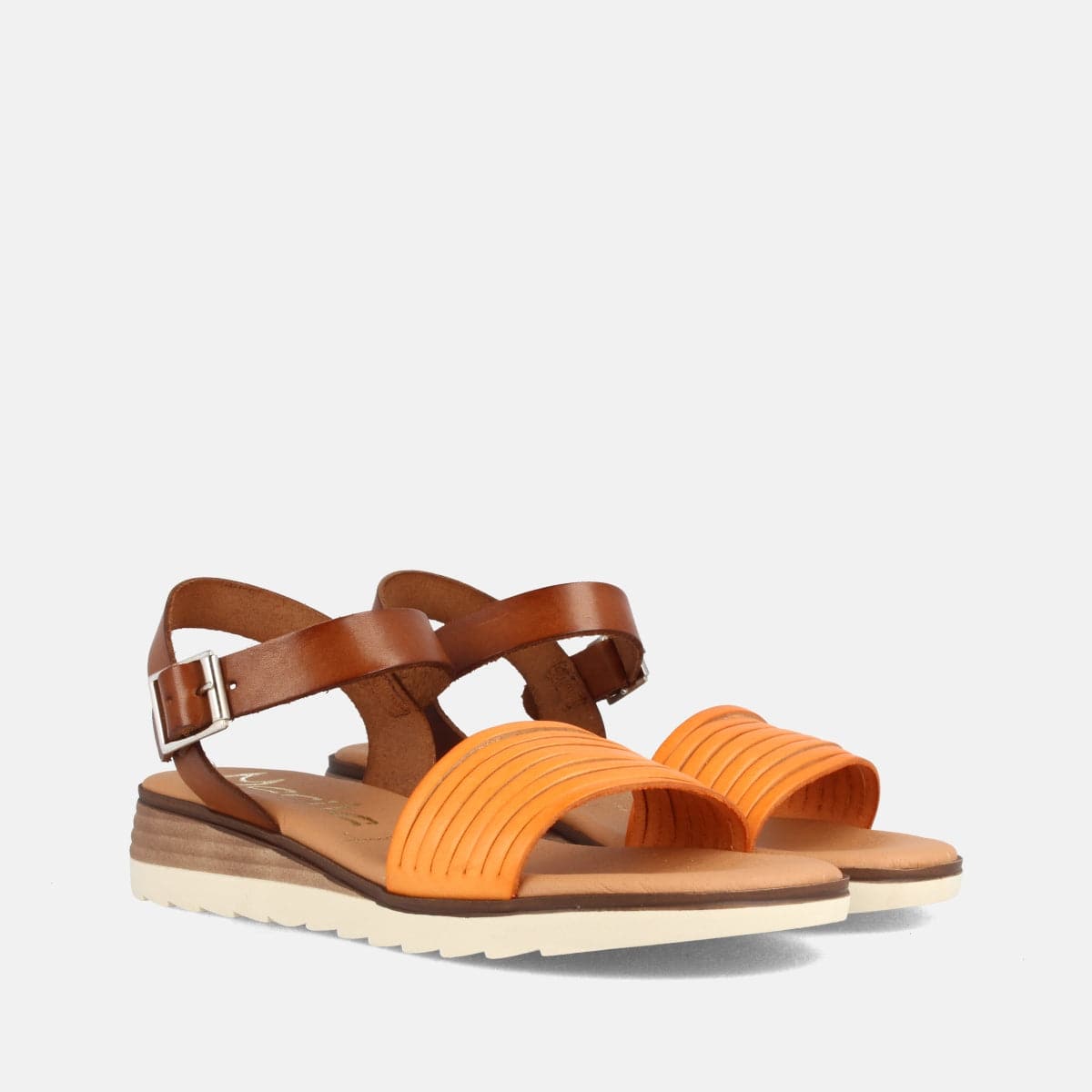 Cómodas y bonitas sandalias para mujer con cuña baja fabricadas en piel vaquetilla combinada en color naranja y avellana.
