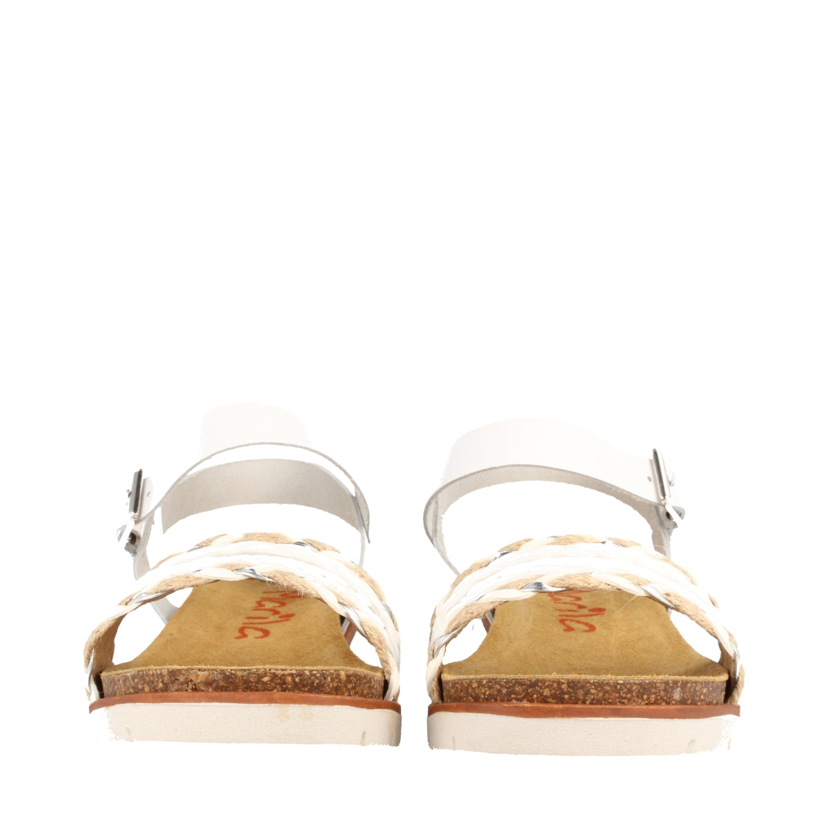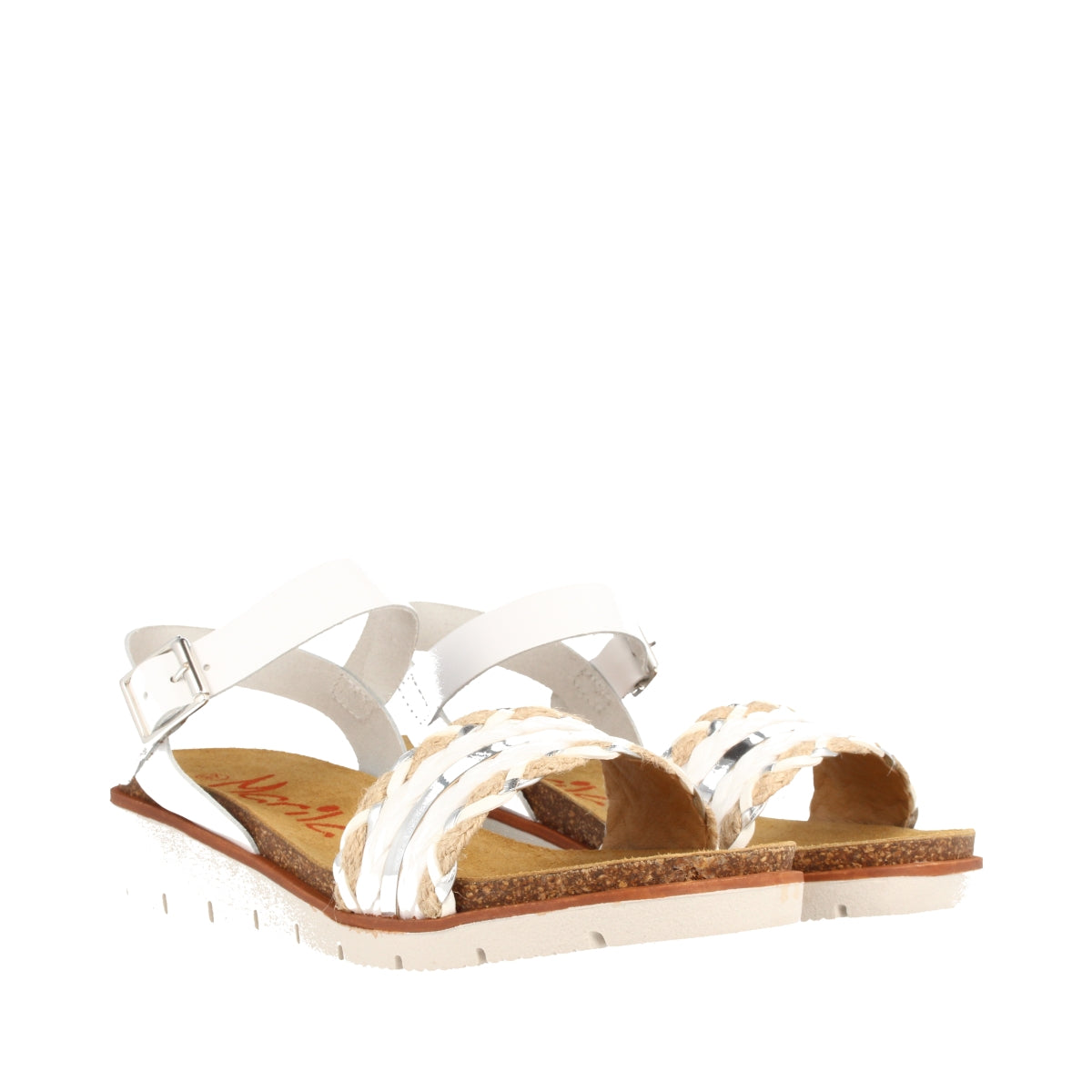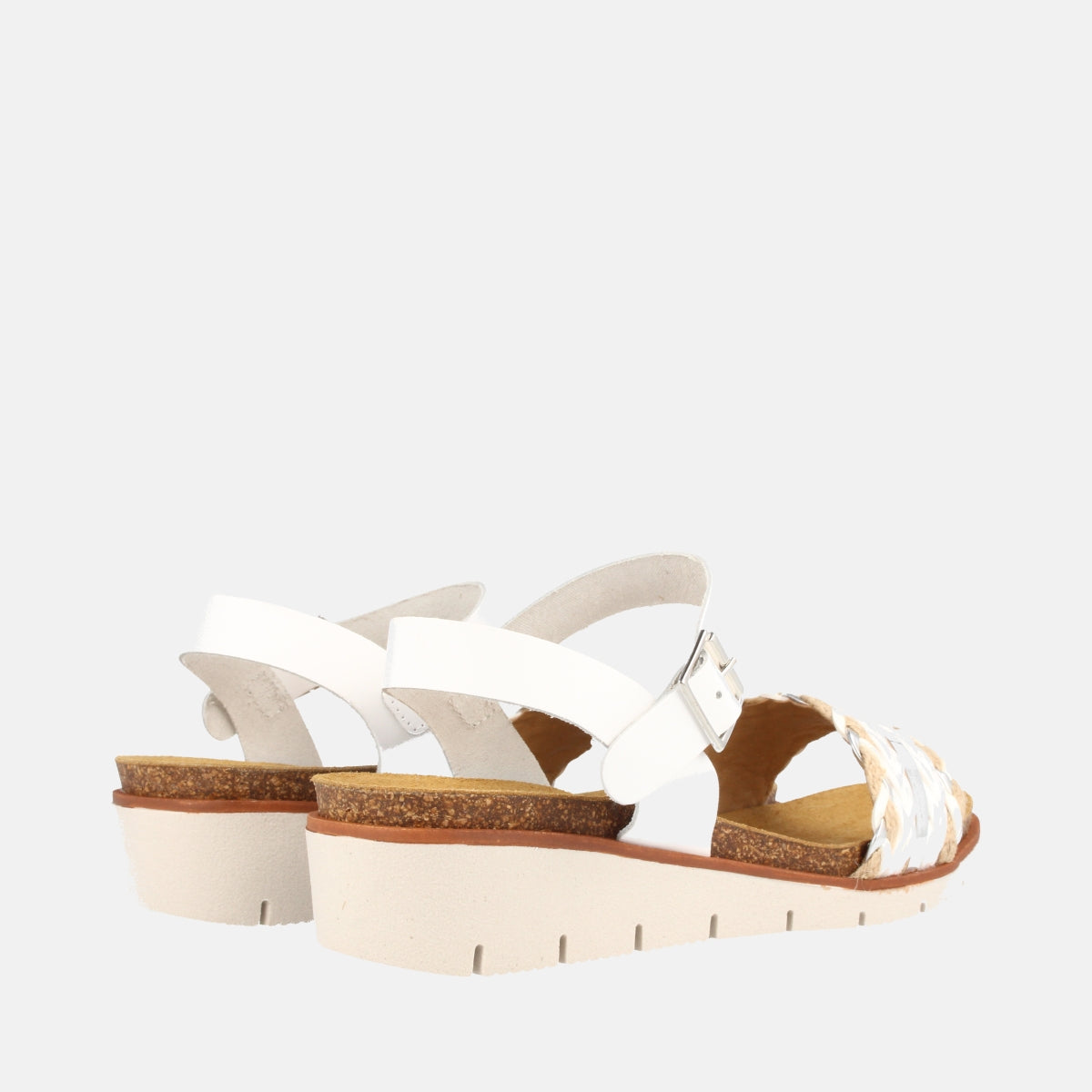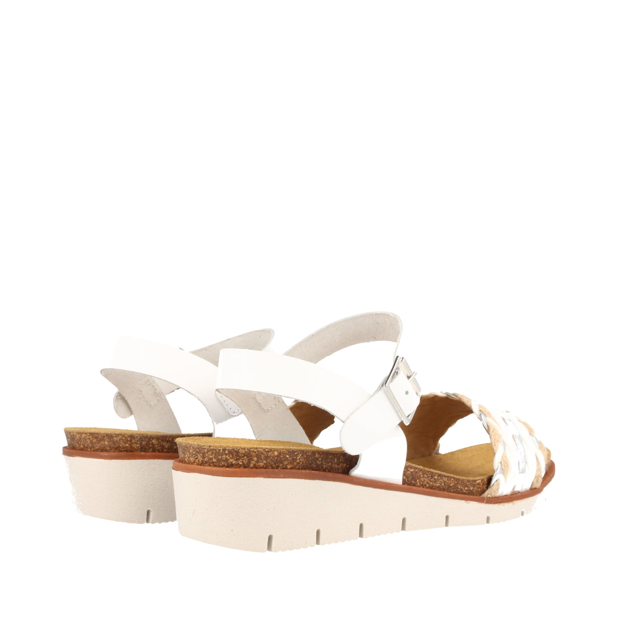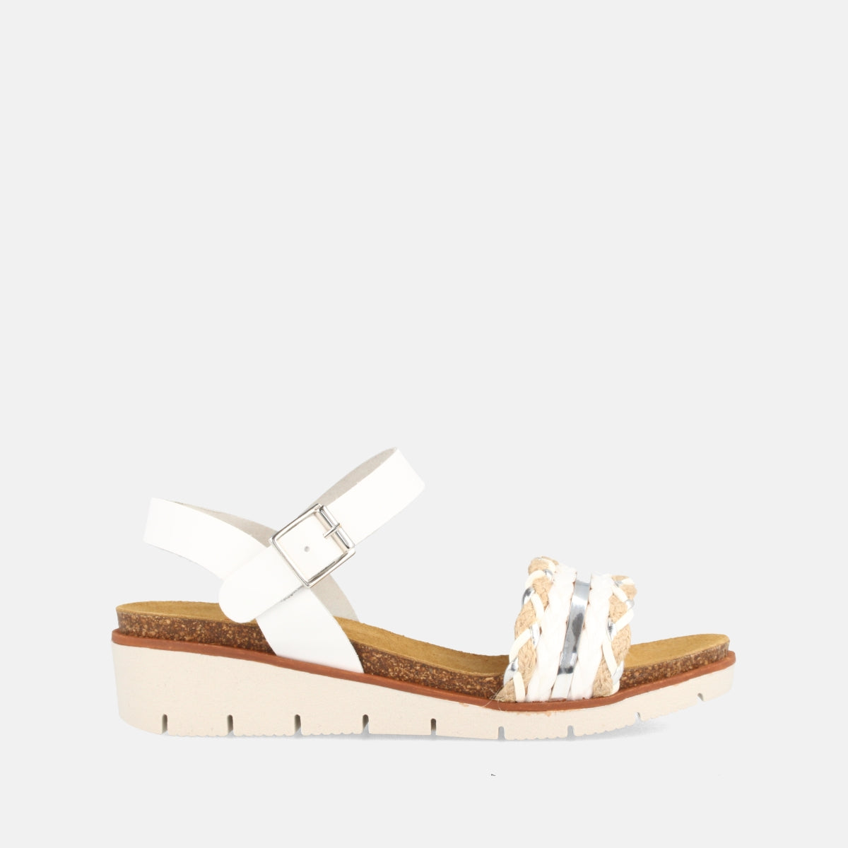 Sandalia para mujer con cuña media combinada en rafia y piel en color blanco.