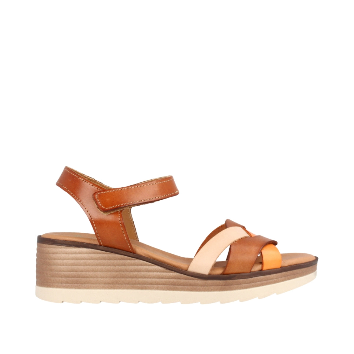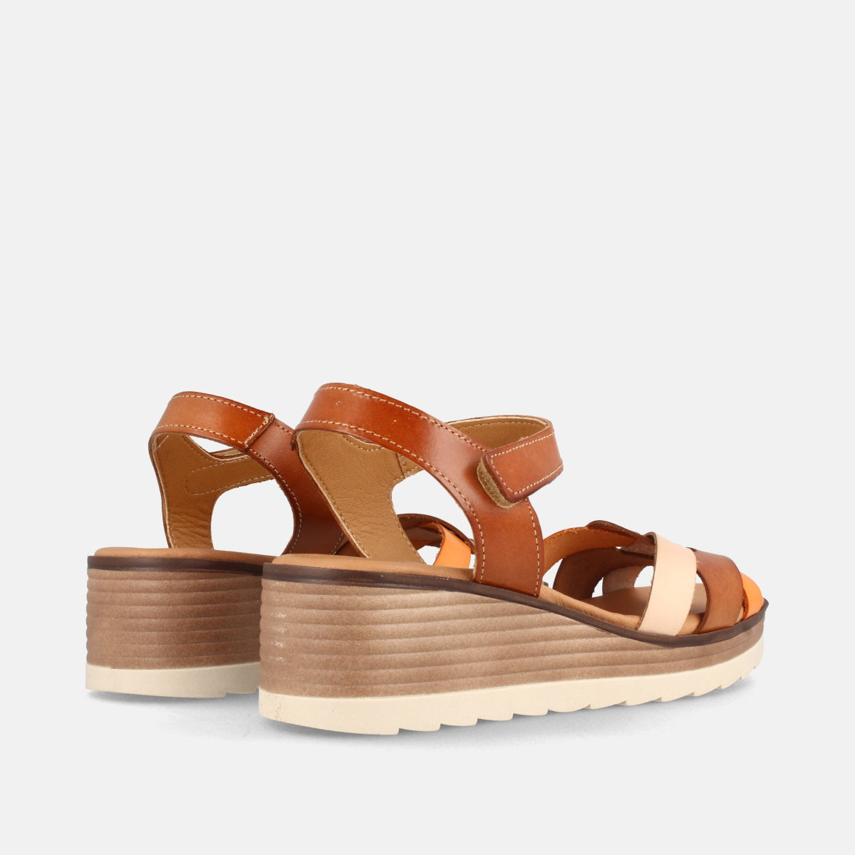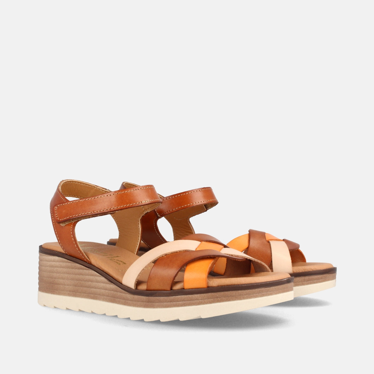 Coloridas sandalias con cuña media en piel combi calabaza.