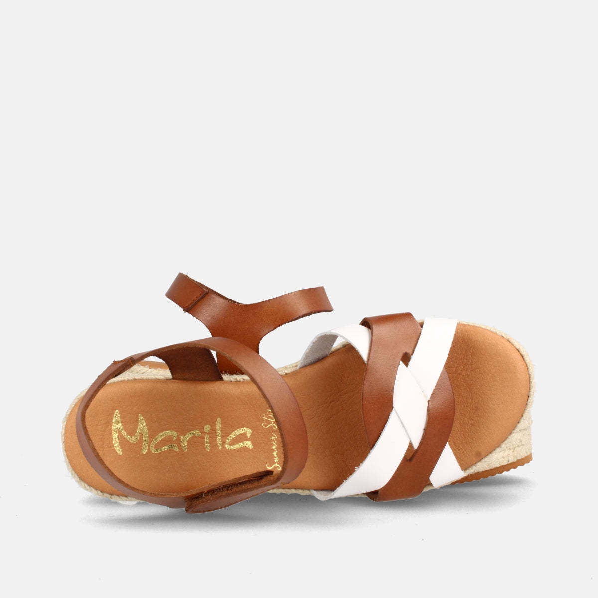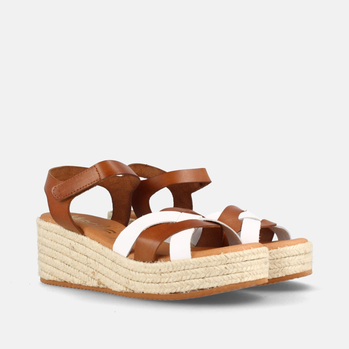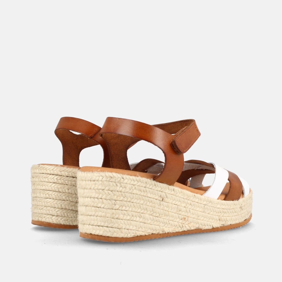 SANDALIA PARA MUJER DE PIEL CON CUÑA MEDIA PANAMÁ BLANCO Y AVELLANA – Marila Shoes