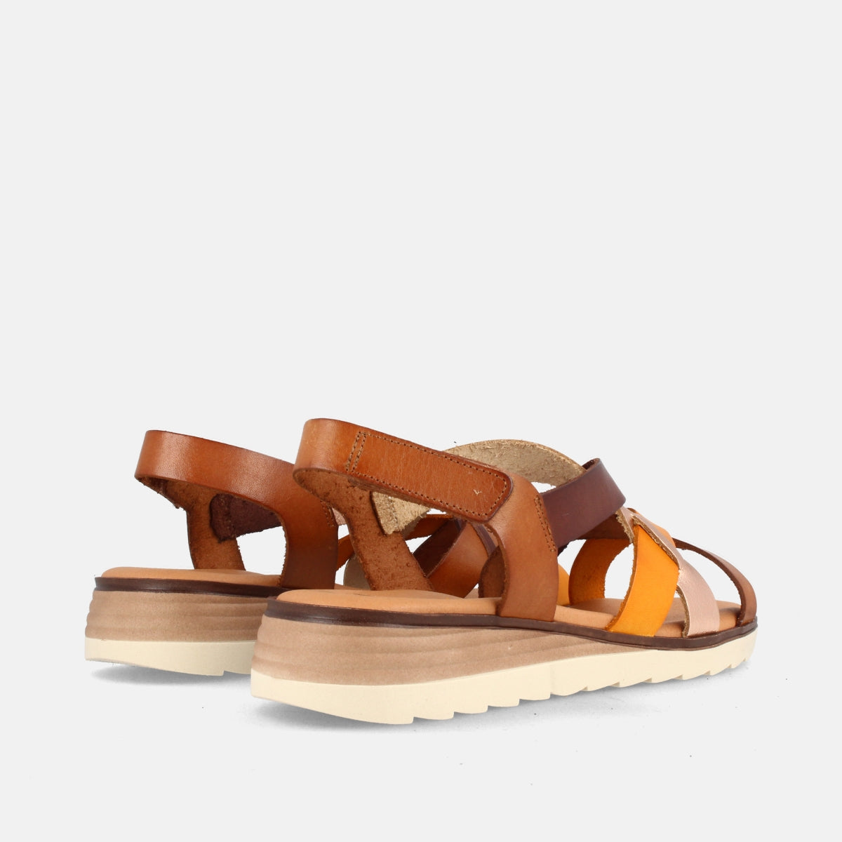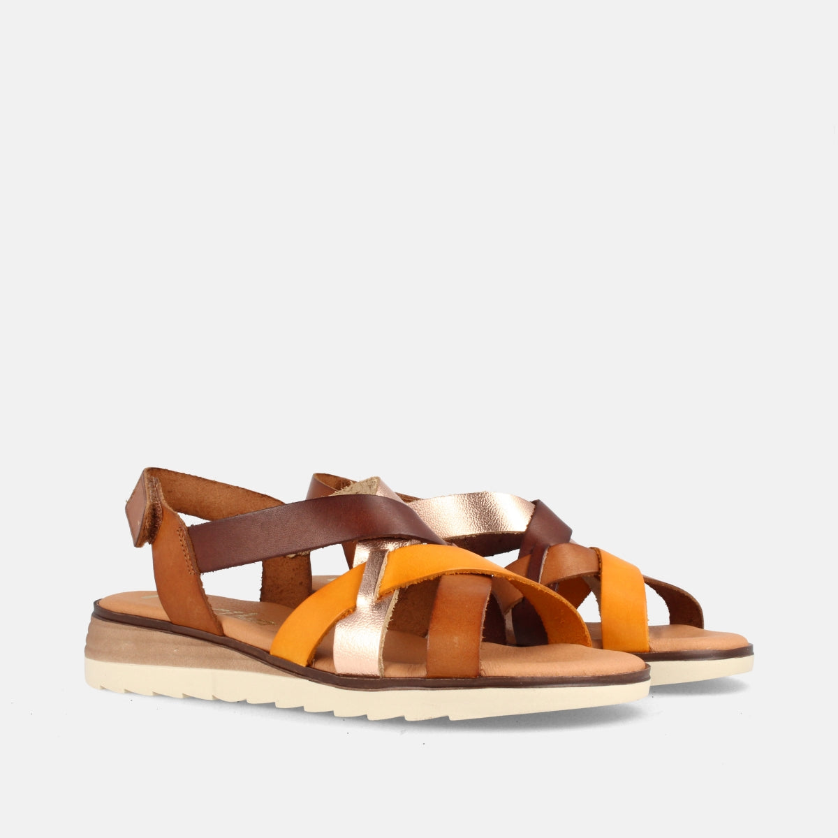 Su estructura está formada por cintas de piel en color cuero y naranja que se entrelazan en el empeine sujetándolo así de forma óptima. El talón queda al descubierto y su cierre es mediante belcro regulable que permite el perfecto ajuste de la sandalia. Dispone de una plantilla con un acolchado de 5mm que hace que sea un calzado con un extra de confortabilidad. El piso es de TR, dentado y combinado en color beig y marrón. Además tiene una altura de 3cm y de 1,5cm en su parte delantera. Es un calzado muy ligero y muy fácil de calzar.