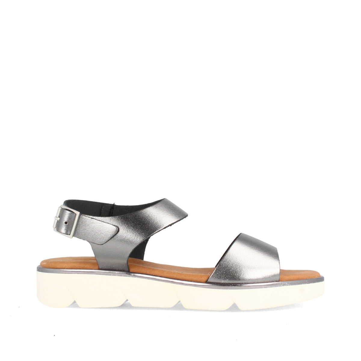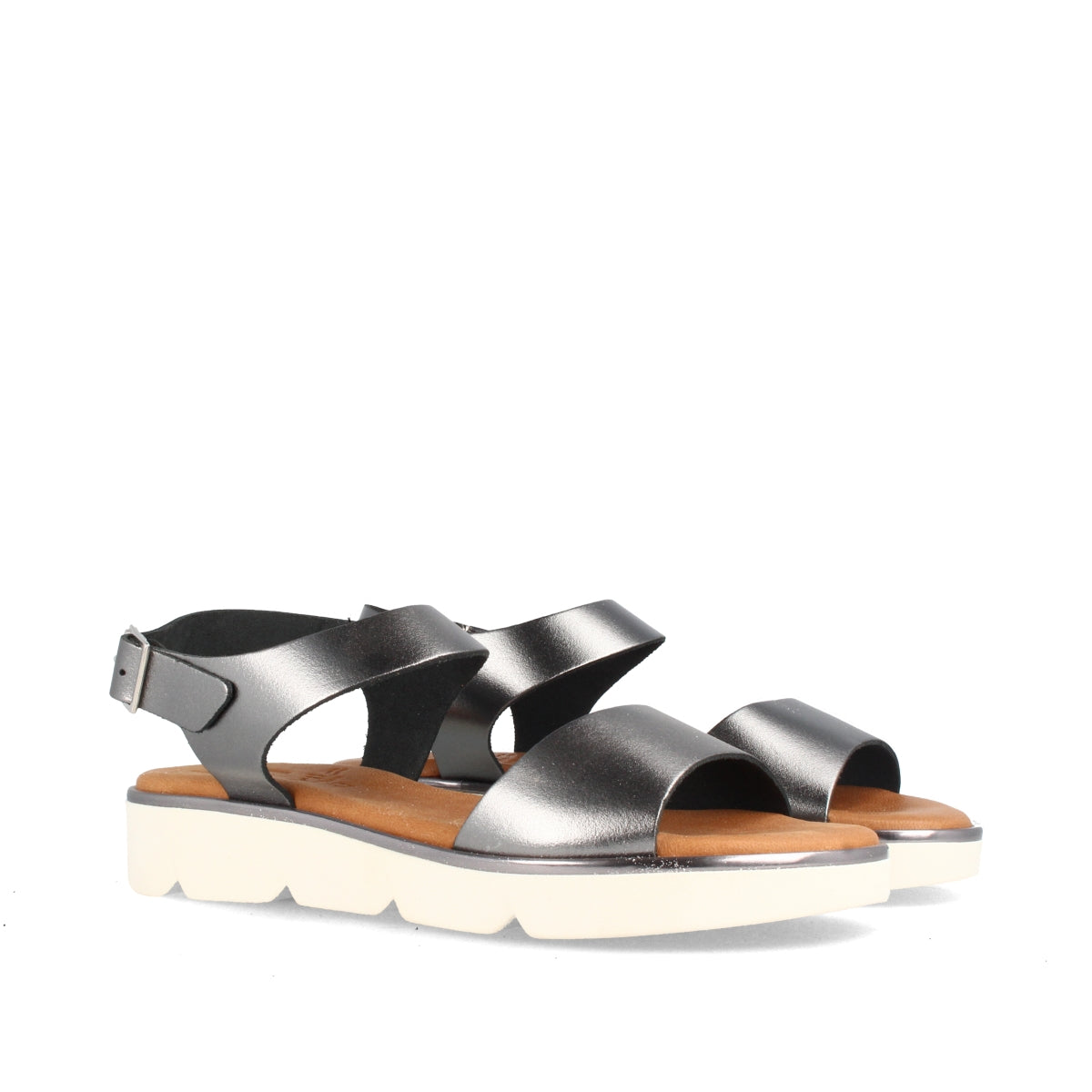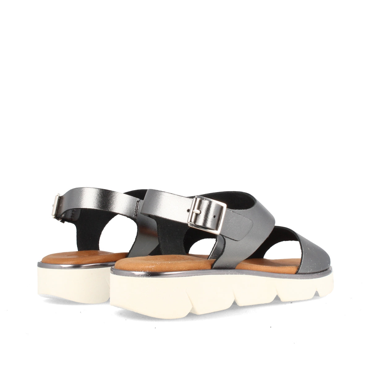Sandalias para mujer con una cuña baja color plomo.